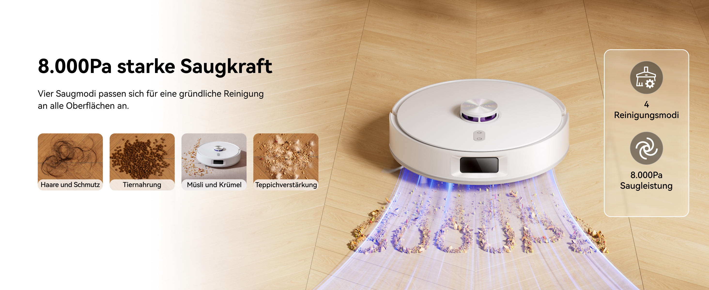 Der Narwal Freo S. revolutioniert Ihre Reinigungsroutine und schenkt Ihnen wertvolle Zeit für die wirklich wichtigen Dinge im Leben. Mit einer beeindruckenden Saugleistung von 8000 Pa sorgt er dafür, dass Ihr Zuhause stets makellos sauber bleibt – ganz ohne Ihr Zutun. Erleben Sie das befreiende Gefühl, wenn der Freo S. selbstständig Flächen von bis zu 140 m² in einem Durchgang reinigt und dabei mühelos Schwellen bis zu 20 mm überwindet. So wird jeder Raum perfekt gepflegt, während Sie sich entspannt zurücklehnen können.