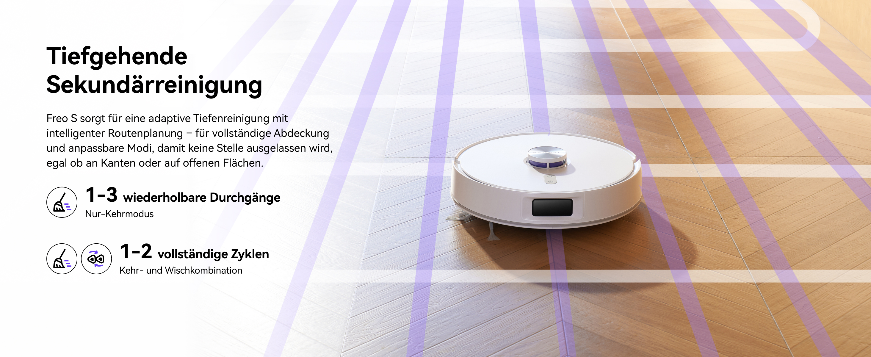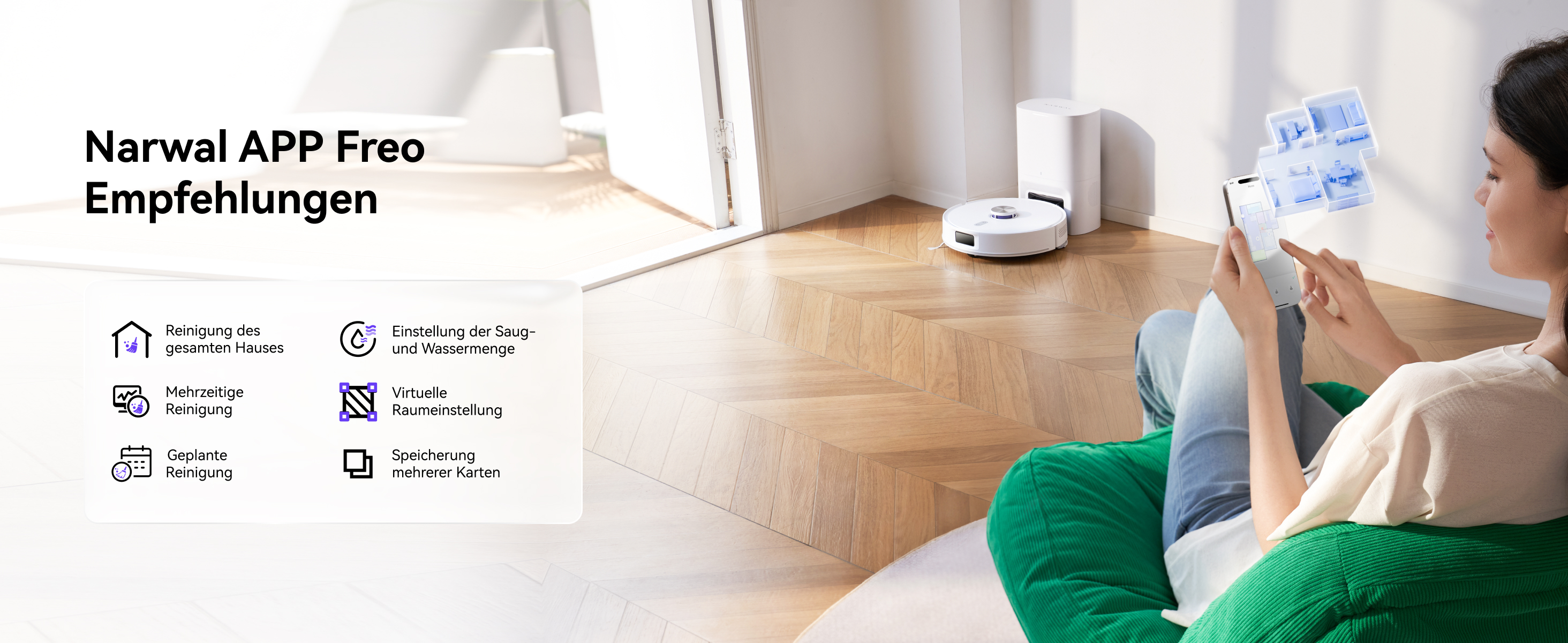 Egal ob Sie Haustiere haben, die täglich Haare verlieren, oder Teppiche besitzen, die eine besonders gründliche Pflege erfordern – der Narwal Freo S. passt sich Ihren individuellen Bedürfnissen optimal an. Nutzen Sie ihn beispielsweise zur gründlichen Reinigung Ihres Wohnzimmers nach einem ausgelassenen Familienfest oder im Schlafzimmer zur zuverlässigen Entfernung von Allergenen. Auch in größeren Wohnungen oder offenen Lofts überzeugt er durch seine Fähigkeit, weitläufige Flächen in einem einzigen Arbeitsgang effizient zu bewältigen.